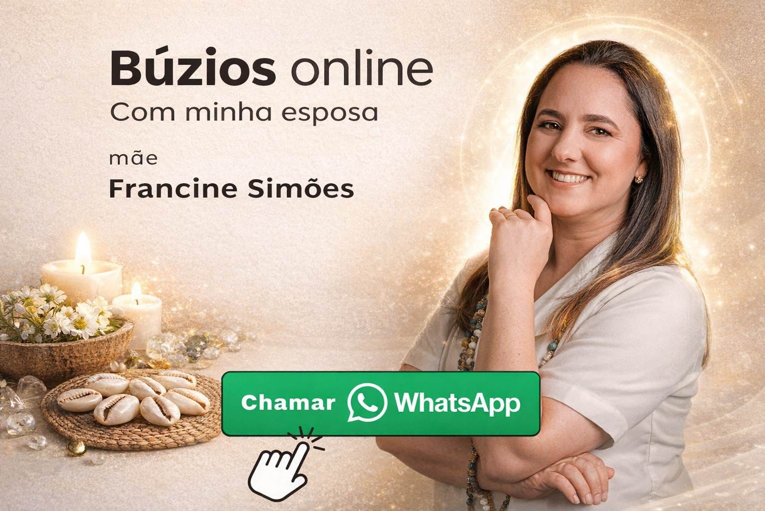 Consultas com búzios para clareza, caminho e proteção com minha esposa, Mãe Francine Simões. Mande mensagem no WhatsApp e marque sua consulta. Valor R$ 250,00. Vídeo chamada de 1h.